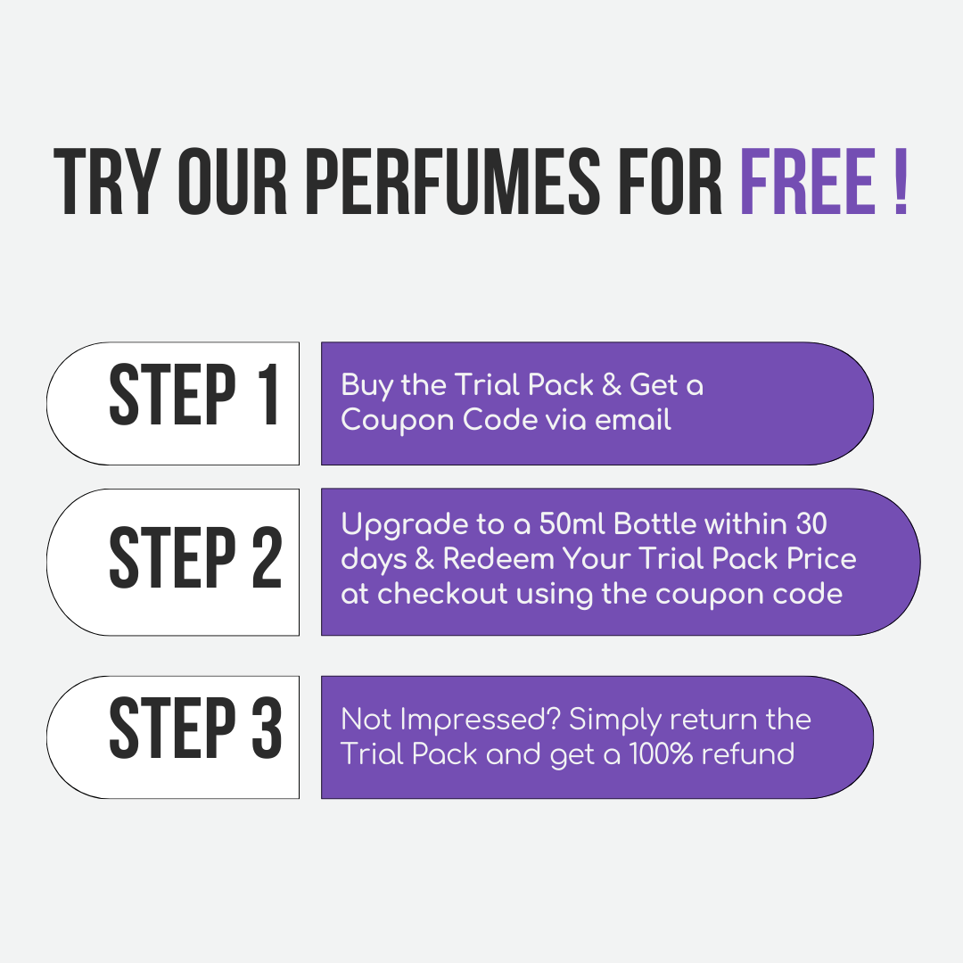 Plus, our Discovery Pack lets you test multiple premium scents without committing to a full bottle, and you get yourentire trial pack price backas a discount when you upgrade to 50 ml bottle